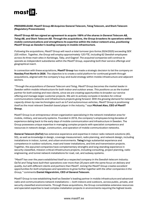 I samband med förvärven har MastIT Group tagit ett strategiskt beslut att under 2026 börsintroducera bolaget på Nasdaq First North. i syfte att skapa förutsättningar för fortsatt förvärvsdriven tillväxt genom bolagets buy-and-build-strategi inom mobil infrastruktur och närliggande områden.