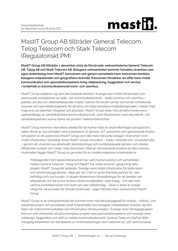 MastIT Group AB tillträder 1 december 2025 de förvärvade verksamheterna General Telecom AB, Telog AB och Stark Telecom AB. Bolagens verksamheter kommer fortsätta utvecklas som egna dotterbolag inom MastIT-koncernen och genom samarbete inom koncernen breddas bolagens erbjudanden och geografiska räckvidd. Koncernen förstärker sin affär inom mobil kommunikation och specialistkompetens kring nätplanering, byggnation och service/underhåll av kommunikationsnät inom- och utomhus.