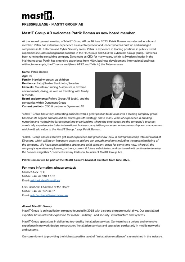 At the annual general meeting of MastIT Group AB on 16 June 2023, Patrik Boman was elected as a board member. Patrik has extensive experience as an entrepreneur and leader who has built up and managed companies in IT, Telecom and Cyber Security areas.